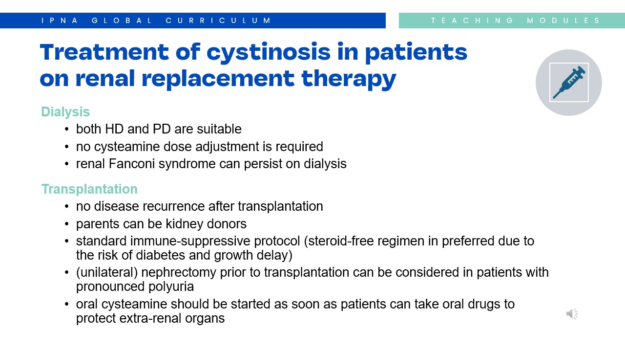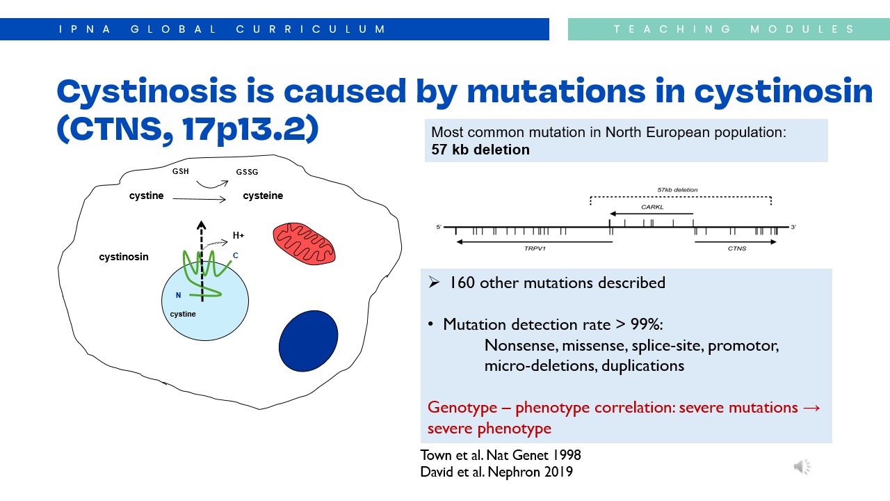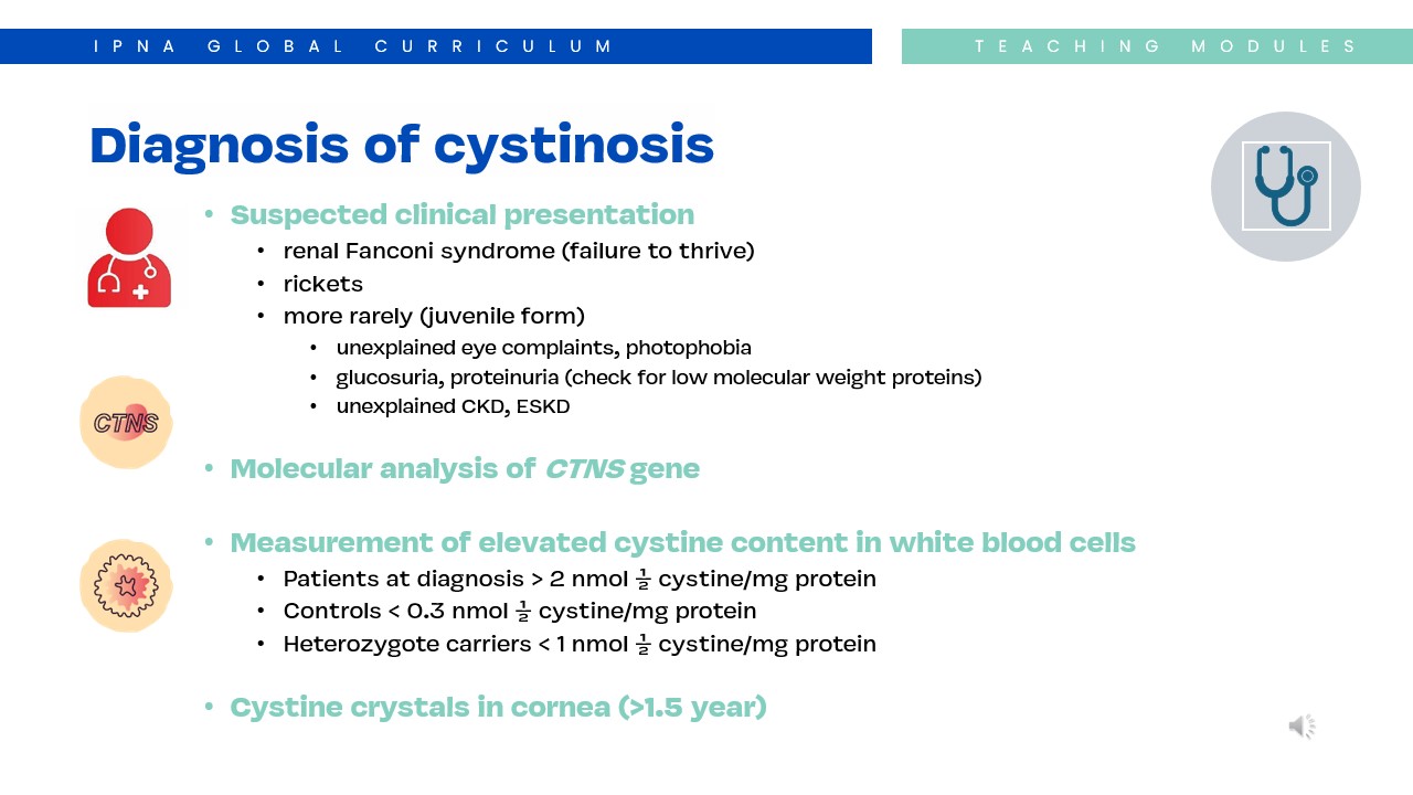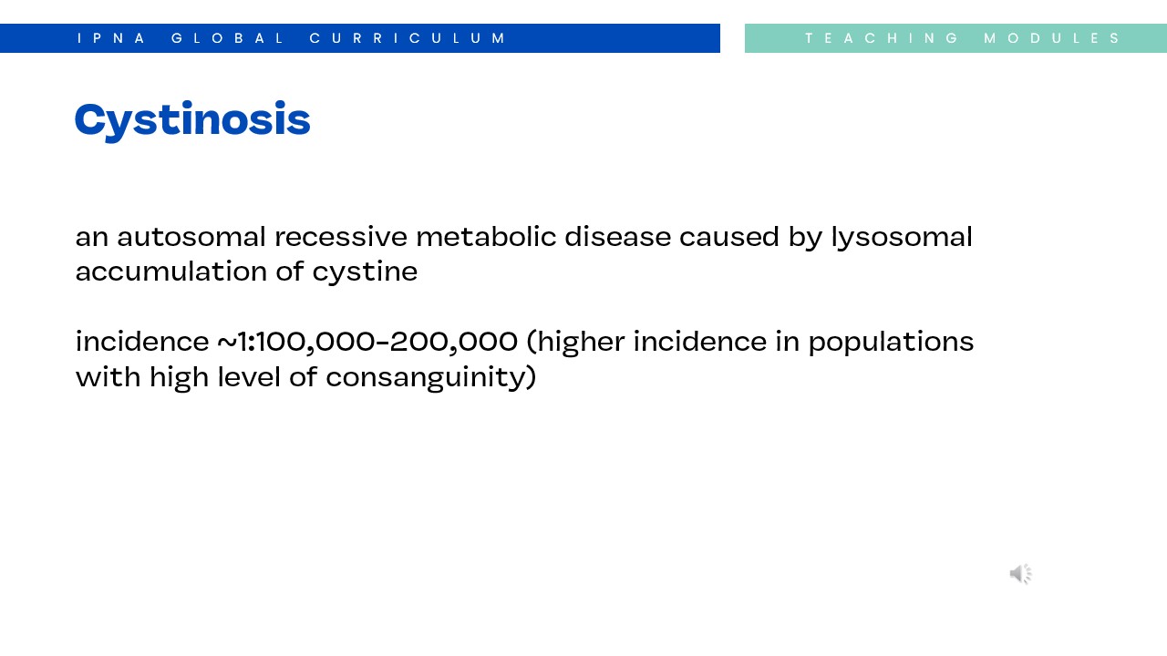 Cystinosis is a rare, autosomal recessive lysosomal storage disorder caused by mutations in the CTNS gene. This results in defective cystinosin, a lysosomal cystine transporter, leading to the accumulation of cystine in lysosomes across tissues. The disease predominantly manifests as nephropathic infantile cystinosis, with early symptoms stemming from renal Fanconi syndrome. If untreated, cystinosis progresses to multiorgan involvement, including kidney failure, endocrine and neurological deficits and muscular disease. Early diagnosis and cystine-depleting therapy with cysteamine, have significantly improved outcomes, transforming the disease from fatal to chronic with a manageable quality of life.